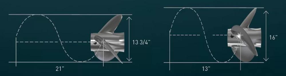 Propellers worden aangegeven met 2 maten. De diameter en de spoed. Door de diameter te vergroten kan de schroef meer water verplaatsen. Hetzelfde idee als met spoed: grotere diameter is meer trekkracht en meer toeren, kleinere diameter is minder trekkracht en meer toeren.